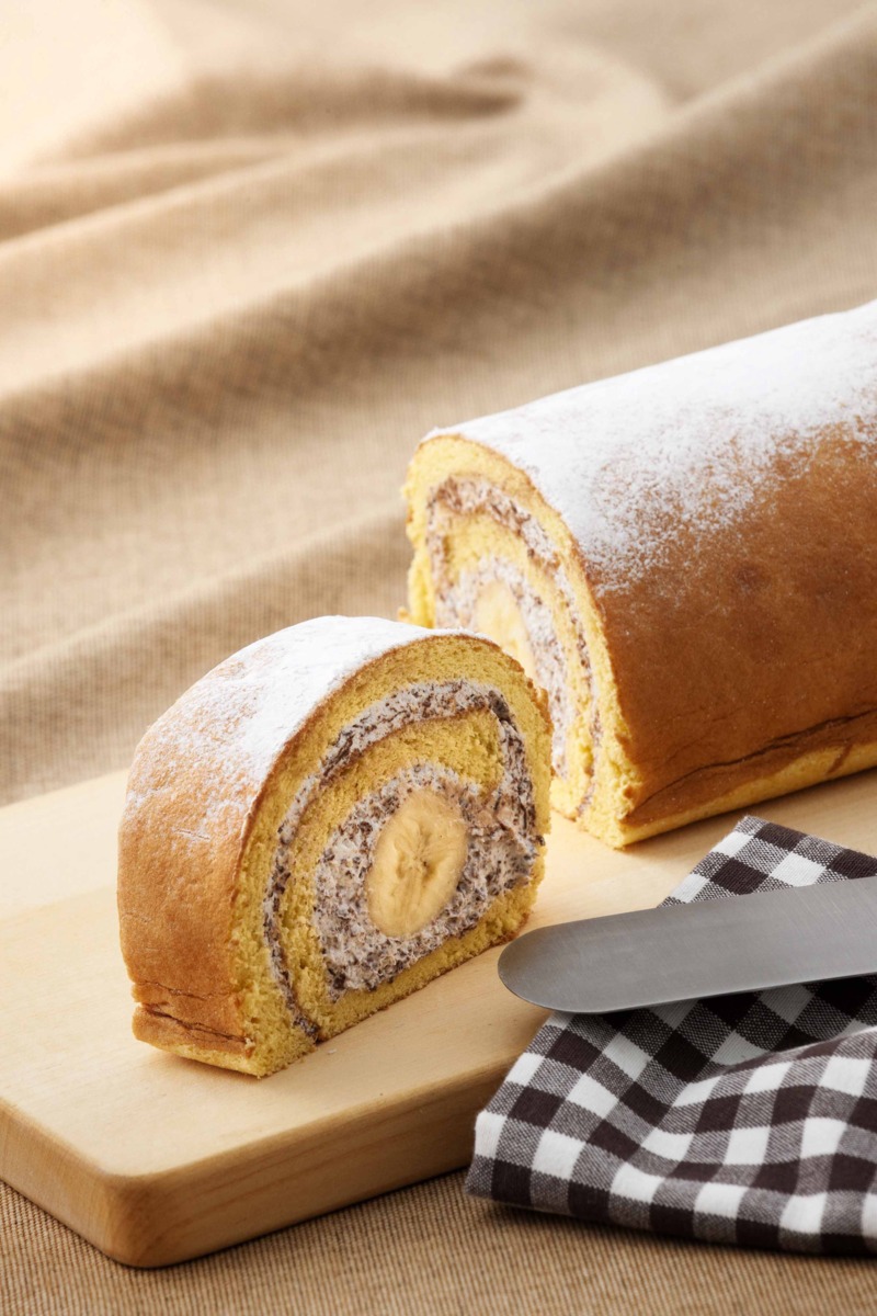 食感が美味しい、チョコチップ入りの生クリームにまるごとバナナ、カスタードクリームも一緒に巻いた、今だけ季節限定のロールケーキ。